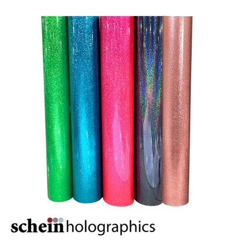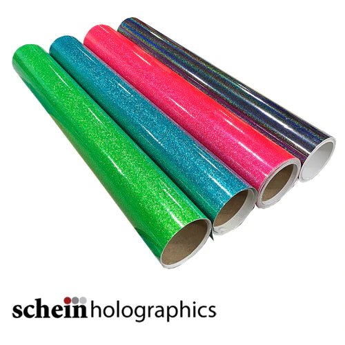 Glitter Holographic vinyl by Schein Holographics offers the dazzling appeal of glitter heat transfer vinyl in a cuttable adhesive vinyl. Schein Glitter is great for the lettering or detailing, and is perfect for adding that twinkle and sparkle to signage. This metalized PVC film is solvent-printable and suitable for application on flat surfaces and simple curves. Schein Holographic films are rated for up to five years outdoors. Not intended for use on garments, fabrics, or vehicles.