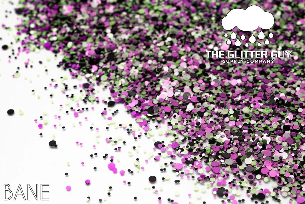 Bane is a dot mix of various sized neon matte black, green and purple circle cut glitter.