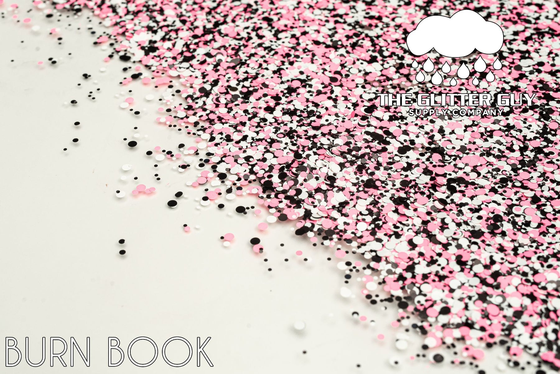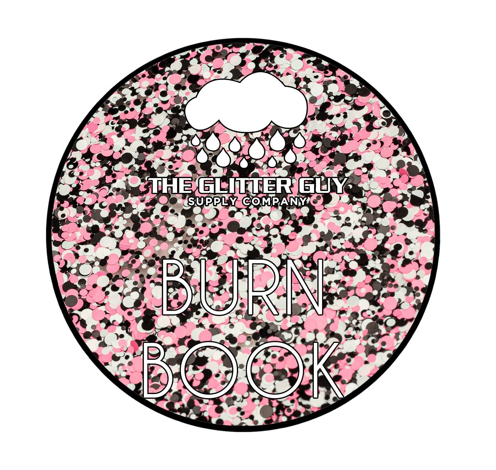 Burn Book is a dot mix of various sized neon matte black, pink and white circle cut glitter.