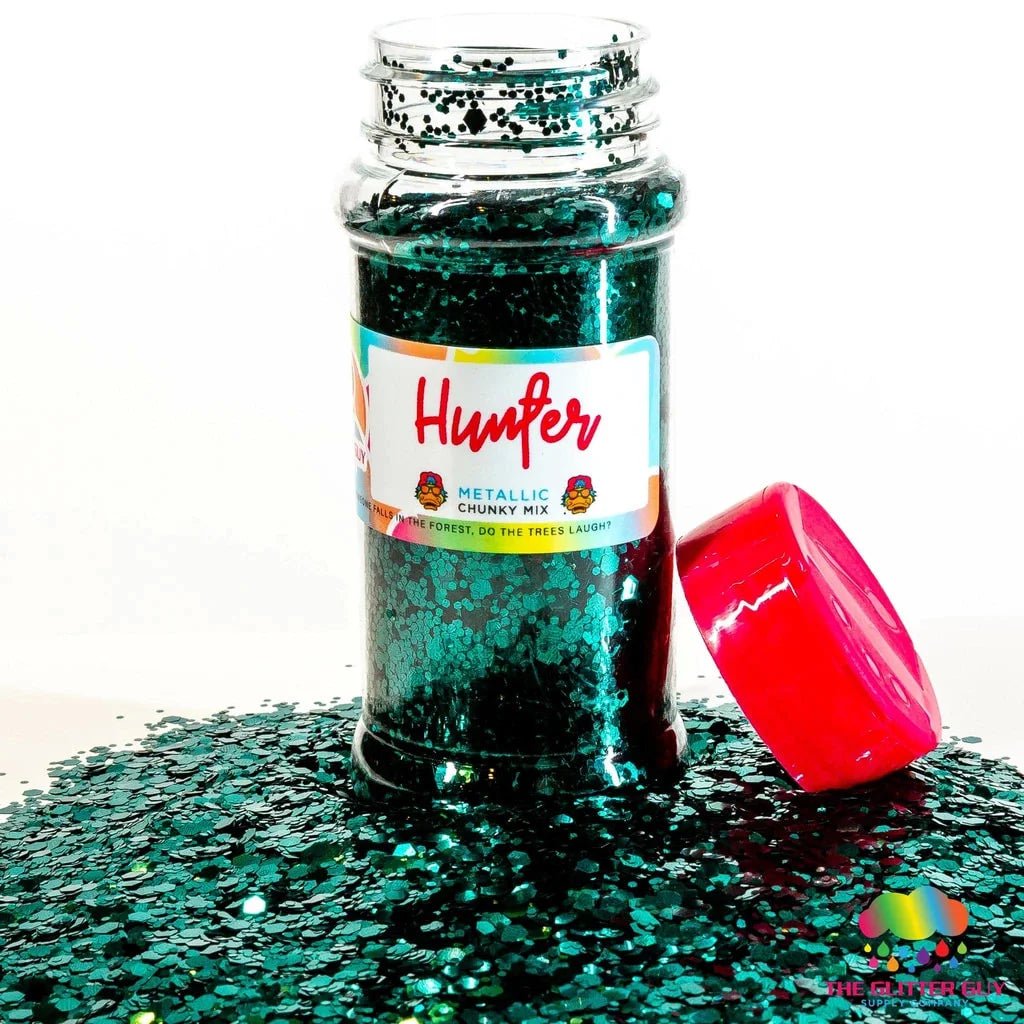 Hunter is a chunky mix of various sized metallic dark emerald green hexagonal cut glitter.