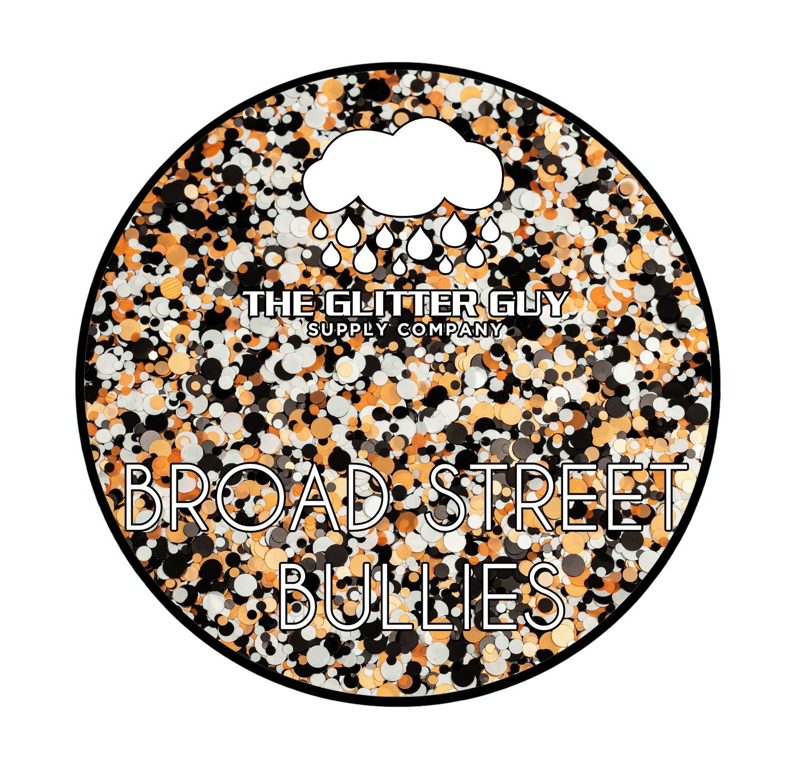 Broad Street Bullies is a dot mix of various sized neon matte black, orange and white circle cut glitter.