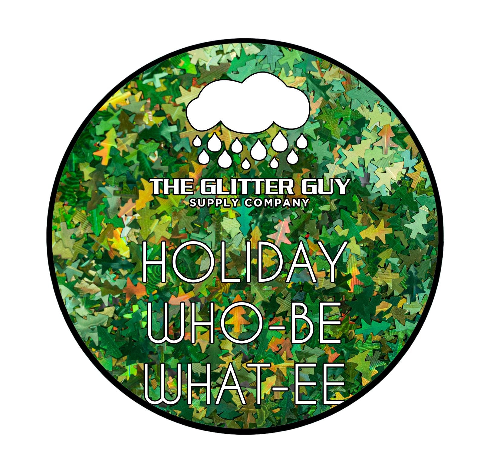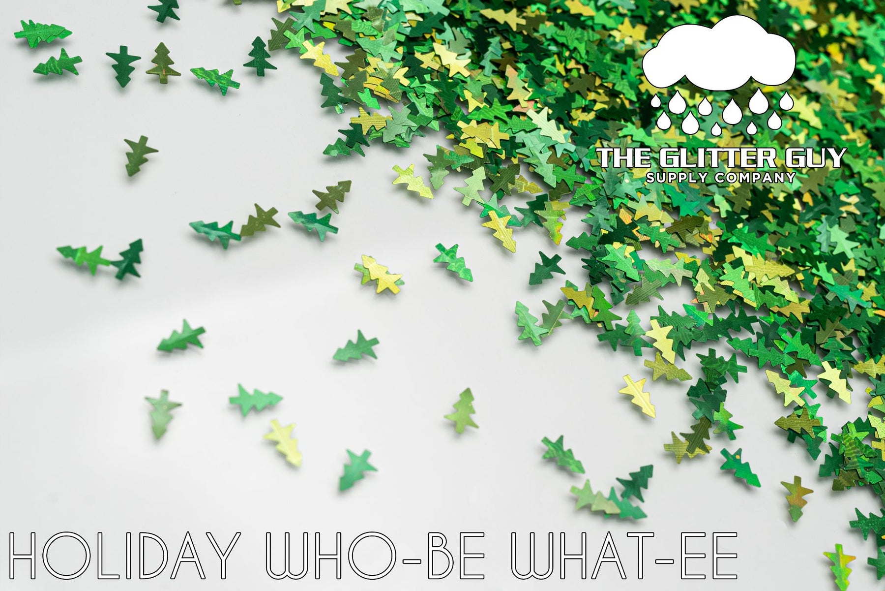 Holiday Who-be What-ee is holographic light and dark green Christmas tree shape cut glitter.